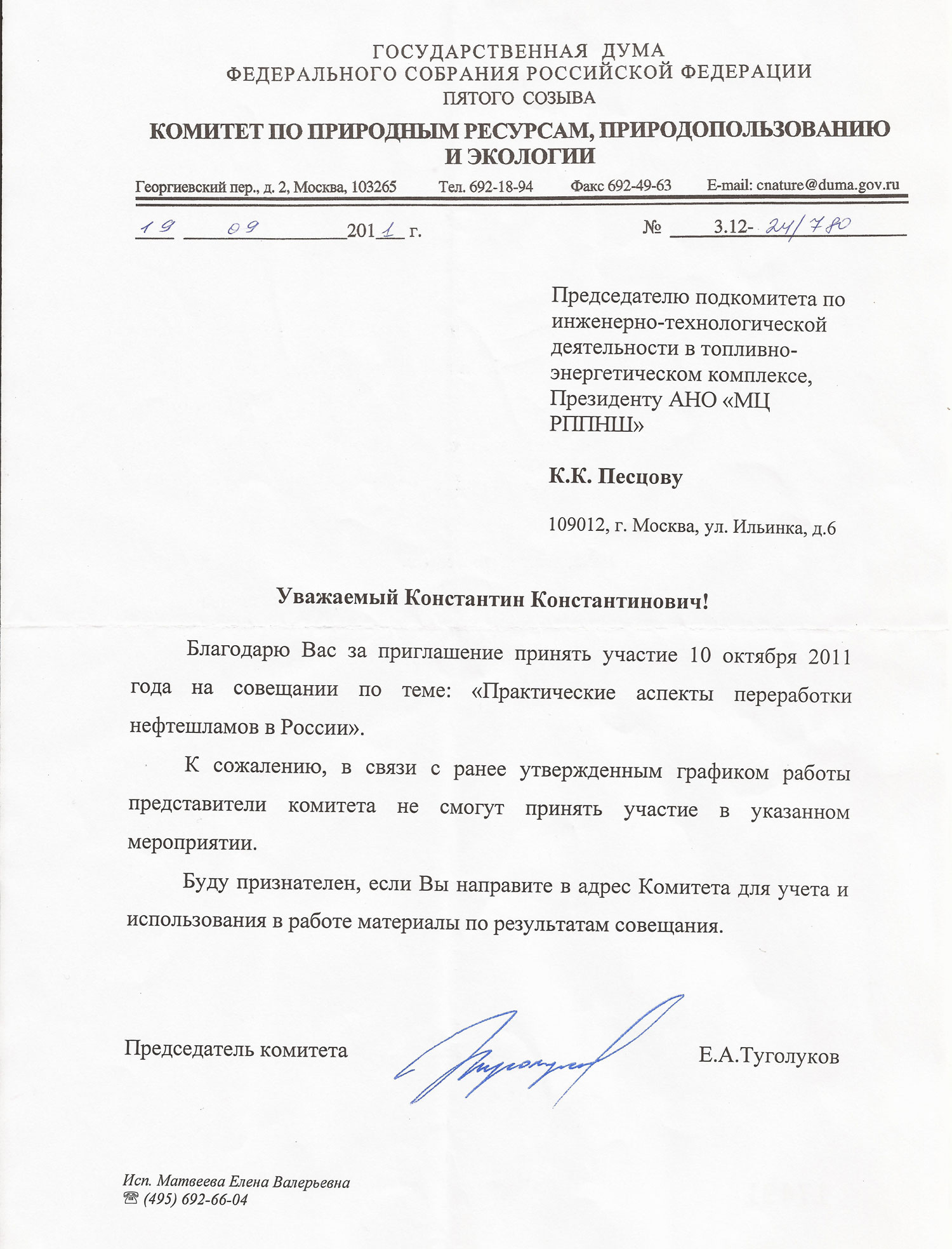 | 1 марта 2012 года в Москве, в Торгово-промышленной палате РФ состоялось заседание круглого стола на тему: «Координация действий законодательной, исполнительной власти и бизнес-сообщества по выполнению Стокгольмской конвенции о стойких органических загрязнителях». |